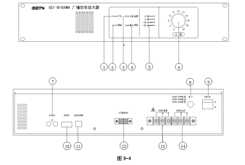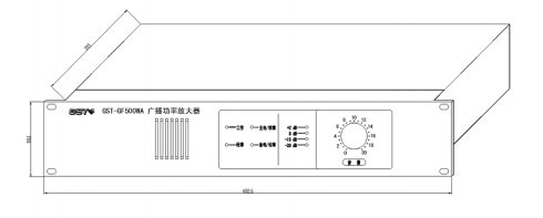 以 GST-GF500WA 型廣播功率放大器為例進(jìn)行說(shuō)明,其外形及結(jié)構(gòu)示意圖如圖 9-3。