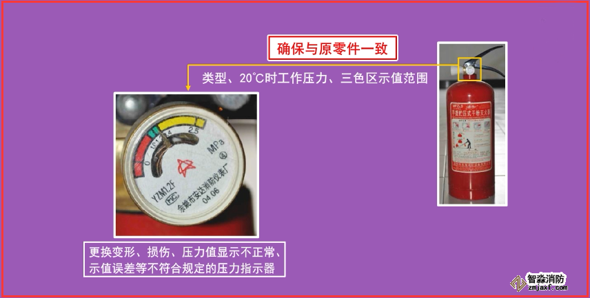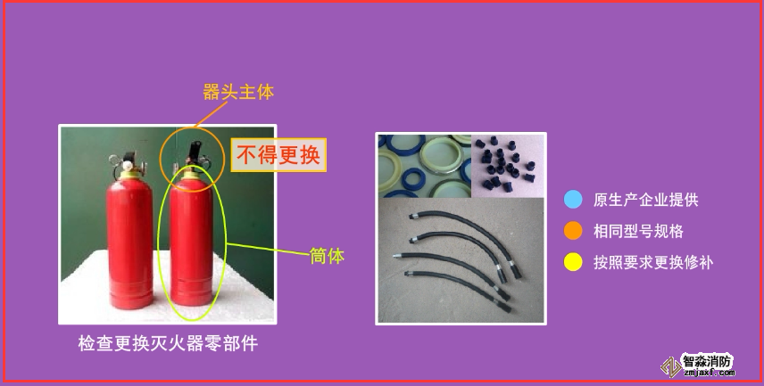 (5)更換具有嚴(yán)重?fù)p傷、變形、銹蝕等影響使用的缺陷的滅火器壓把、提把等金屬件;更換存在肉眼可見(jiàn)缺陷的儲(chǔ)氣瓶式滅火器的頂針。