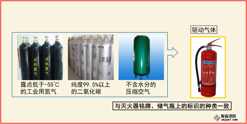 (6)儲(chǔ)壓式干粉滅火器和潔凈氣體滅火器可選用露點(diǎn)低于-55℃的工業(yè)用氮?dú)?、純?9.5%以上的二氧化碳、不含水分的壓縮空氣等作為驅(qū)動(dòng)氣體,但要與滅火器銘牌、儲(chǔ)氣瓶上標(biāo)識(shí)的種類(lèi)一致。