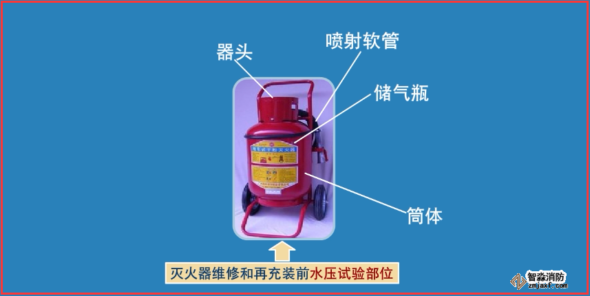 (9) 更換已損壞的推車(chē)式滅火器的車(chē)輪和車(chē)架組件的固定單元、噴射軟管的固定裝置。