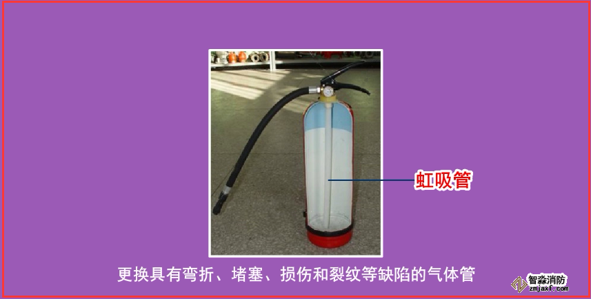(6)更換具有彎折、堵塞、損傷和裂紋等缺陷的滅火器虹吸管、儲氣瓶式滅火器出氣管。