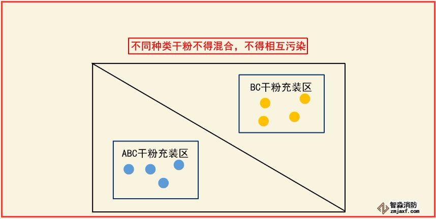 (3)ABC干粉、BC干粉充裝設(shè)備分別獨立設(shè)置,充裝場地完全分隔開。不同種類干粉不得混合,不得相互污染。