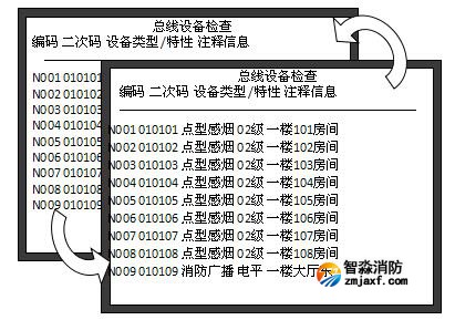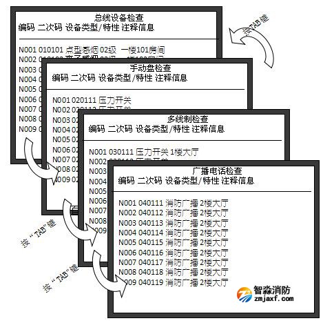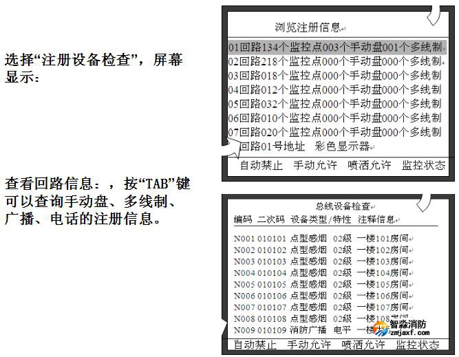 選中某一回路,按下“確認(rèn)”鍵,將顯示這一回路注冊(cè)到的各設(shè)備的信息,最上一行的設(shè)備高亮顯示;按任意數(shù)字鍵高亮消失,控制器處于總線(xiàn)設(shè)備檢查狀態(tài)
