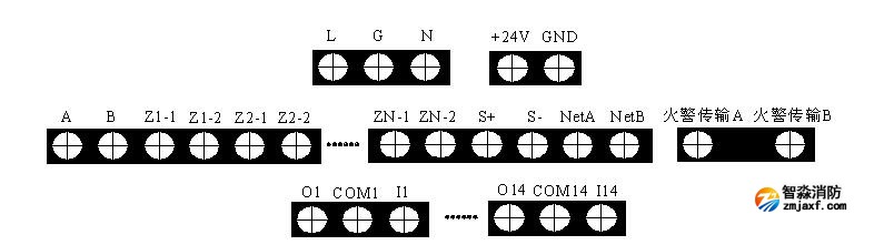 火警傳輸A、火警傳輸B:連接火警傳輸設(shè)備通訊總線(xiàn)端子(選配);