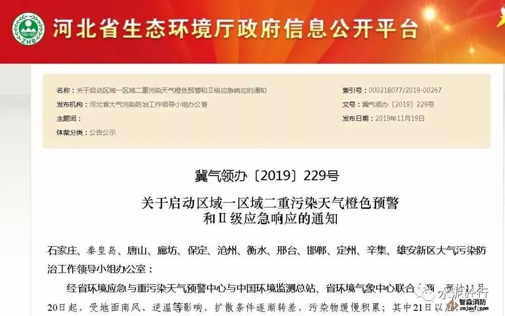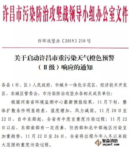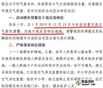 為保護(hù)公眾健康,降低大氣污染強度,指揮部辦公室決定于11月20日13:30時發(fā)布重污染天氣橙色預(yù)警信息,從2019年11月20日16時起啟動Ⅱ級應(yīng)急響應(yīng)。