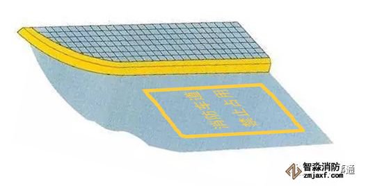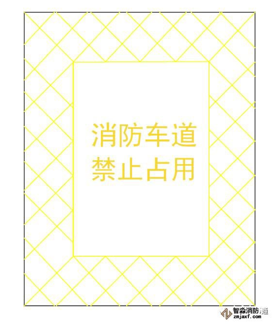 在單位或者住宅區(qū)的消防車通道出入口路面,按照消防車通道凈寬施劃禁停標(biāo)線,標(biāo)線為黃色網(wǎng)狀實線,外邊框線寬20厘米,內(nèi)部網(wǎng)格線寬10厘米,內(nèi)部網(wǎng)格線與外邊框夾角45度,標(biāo)線中央位置沿行車方向標(biāo)注內(nèi)容為“消防車道禁止占用”的警示字樣;