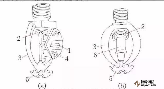 自動(dòng)噴頭是閉式自動(dòng)噴水滅火系統(tǒng)的關(guān)鍵組件,系通過(guò)熱敏感釋放機(jī)構(gòu)的動(dòng)作而噴水。它由噴水口、溫感釋放器(控制器)和濺水盤(pán)組成,其形狀和樣式較多,下圖為常用的低熔點(diǎn)金屬控制器自動(dòng)噴頭和爆炸瓶式自動(dòng)噴頭。