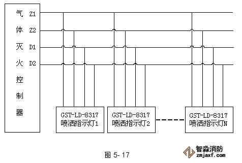 噴灑燈與氣體滅火控制器的總線和電源DC24V相連,實現(xiàn)噴灑噴灑功能。具體連接方法如圖5-17所示。
