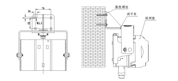 探測(cè)器采用壁掛式安裝,將調(diào)節(jié)架安裝于墻上,然后再將探測(cè)器掛到調(diào)節(jié)架的掛架上,最后固定,具體安裝步驟如下: