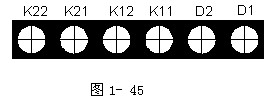 當(dāng)使用觸點(diǎn)信號(hào)輸出信息時(shí),探測(cè)器上的堵頭需換成過(guò)線(xiàn)接頭(需另外購(gòu)買(mǎi)過(guò)線(xiàn)接頭),火警無(wú)源輸出常開(kāi)觸點(diǎn)K11、K12和故障無(wú)源輸出常開(kāi)觸點(diǎn)K21、K22的引線(xiàn)需從過(guò)線(xiàn)接頭引出,探測(cè)器對(duì)外接線(xiàn)端子示意圖如圖1-45所示: