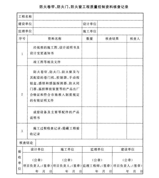 2、防火卷簾、防火門、防火窗工程質(zhì)量驗收前,施工單位應提供下列文件資料,并應按下表填寫資料核查記錄:
