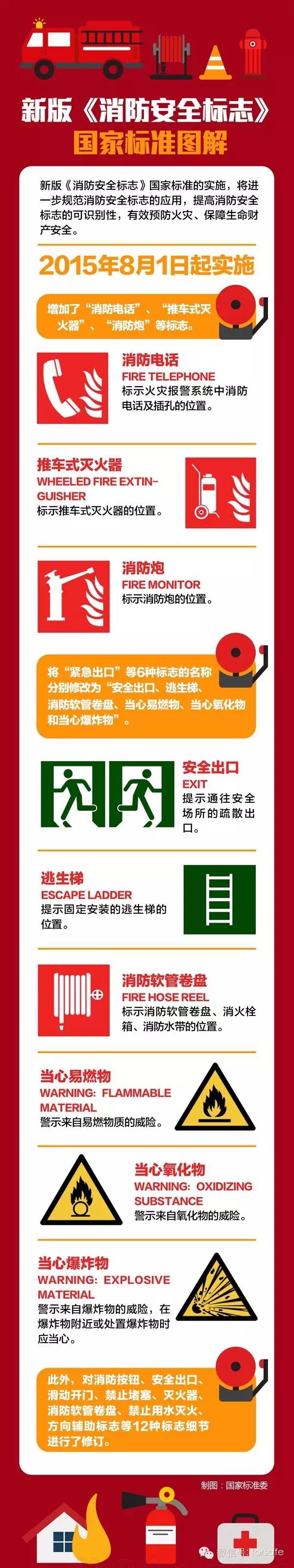 據(jù)從國家標(biāo)準(zhǔn)委獲悉,新修訂的GB13495.1—2015《消防安全標(biāo)志第1部分:標(biāo)志》國家標(biāo)準(zhǔn)將于今年8月1日起正式實施。