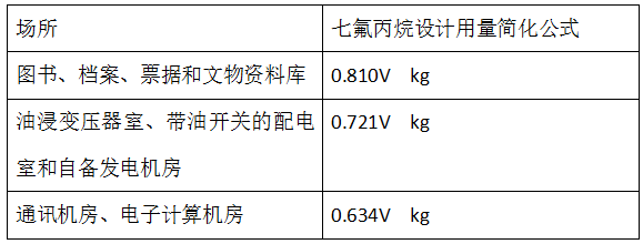 一般情況下,各場所的七氟丙烷設(shè)計用量粗算公式(單位:kg)