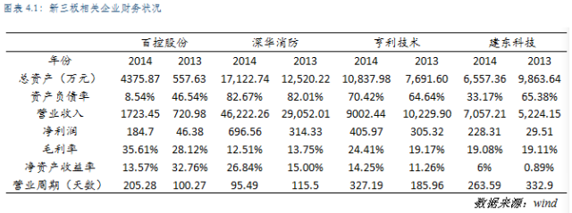 2013年四家可比樣本公司最低營(yíng)收規(guī)模為720.98萬(wàn)元,最高為29,052.01萬(wàn)元,平均營(yíng)收規(guī)模為11,306.76萬(wàn)元。2014年百控股份、深華消防、亨利技術(shù)以及建東科技營(yíng)業(yè)收入分別增長(zhǎng)139.04%、59.1%、-12%和35.09%,平均營(yíng)業(yè)收入規(guī)模達(dá)到16,001.34萬(wàn)元,較2013年增長(zhǎng)了41.52%,遠(yuǎn)高于GDP增速。樣本企業(yè)營(yíng)收規(guī)模同樣實(shí)現(xiàn)了快速增長(zhǎng)。