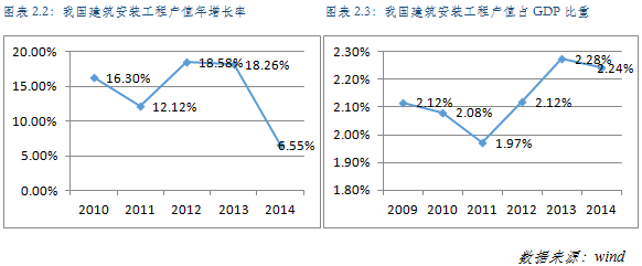 近幾年我國(guó)建筑安裝工程業(yè)產(chǎn)值呈逐年上升趨勢(shì),2014年我國(guó)建筑安裝工程業(yè)產(chǎn)值已達(dá)14,259.79億元。然而從增長(zhǎng)速度來(lái)看,2014年我國(guó)建筑安裝工程業(yè)產(chǎn)值較2013年增長(zhǎng)6.55%,低于7.4%的GDP增速,產(chǎn)值增速較2013年大幅下降11.71個(gè)百分點(diǎn)。2014年建筑安裝工程產(chǎn)值占GDP比重由2013年的2.28%下滑至2.24%。我國(guó)經(jīng)濟(jì)增速的減緩和房地產(chǎn)市場(chǎng)的遇冷已經(jīng)使得建筑安裝工程行業(yè)呈現(xiàn)出增長(zhǎng)乏力態(tài)勢(shì)。