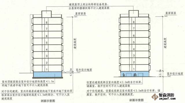 對(duì)于住宅建筑,設(shè)置在底部且室內(nèi)高度不大于2.2m的自行車庫(kù)、儲(chǔ)藏室、敞開空間,室內(nèi)外高差或建筑的地下或半地下室的頂板面高出室外設(shè)計(jì)地面的高度不大于1.5m的部分,可不計(jì)入建筑高度。