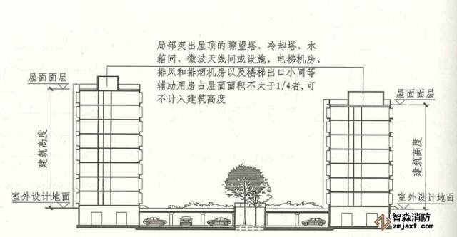 局部突出屋頂?shù)泥谕?、冷卻塔、水箱間、微波天線間或設(shè)施、電梯機(jī)房、排風(fēng)和排煙機(jī)房以及樓梯出口小間等輔助用房占屋面面積不大于1/4者,可不計(jì)入建筑高度。