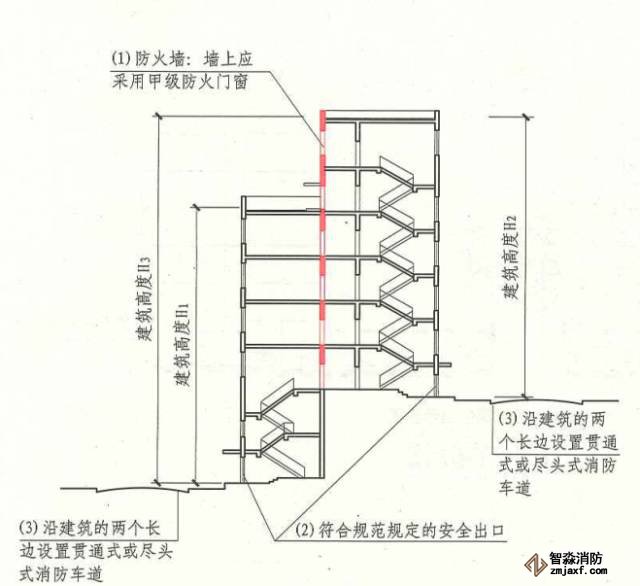 對(duì)于臺(tái)階式地坪,當(dāng)位于不同高程地坪上的同一建筑之間有防火墻分隔,各自有符合規(guī)范規(guī)定的安全出口,且可沿建筑的兩個(gè)長(zhǎng)邊設(shè)置貫通式或盡頭式消防車道時(shí),可分別計(jì)算各自的建筑高度。否則,應(yīng)按其中建筑高度最大者確定該建筑的建筑高度。