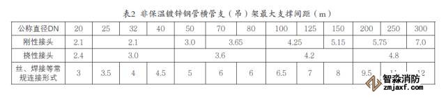 (1)嚴(yán)格控制支(吊)架的安裝間距。溝槽連接因其自身特點(diǎn),對支(吊)架的安裝要求較高。以不保溫鍍鋅鋼管橫管段為例,其支(吊)架較絲接、焊接等傳統(tǒng)連接方式允許的最大支撐間距更短。(見表2)