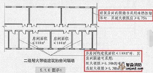5.1.6二級(jí)耐火等級(jí)建筑內(nèi)采用難燃性墻體的房間隔墻,其耐火極限不應(yīng)低于0.75h;當(dāng)房間的建筑面積不大于100平方米時(shí),房間隔墻可采用耐火極限不低于0.50h的難燃性墻體或耐火極限不低于0.30h的不燃性墻體?!緢D示1】