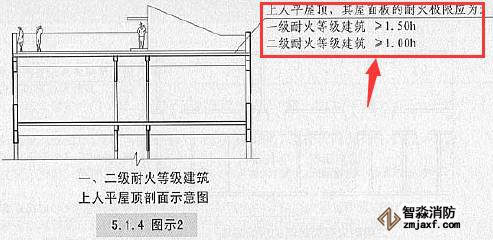 一、二級(jí)耐火等級(jí)建筑的上人平屋頂,其屋面板的耐火極限分別不應(yīng)低于1.50h和1.00h。【圖示2】