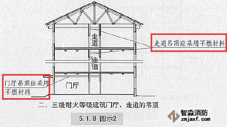 二、三級(jí)耐火等級(jí)建筑內(nèi)門(mén)廳、走道的吊頂應(yīng)采用不燃材料。【圖示2】