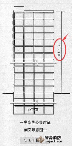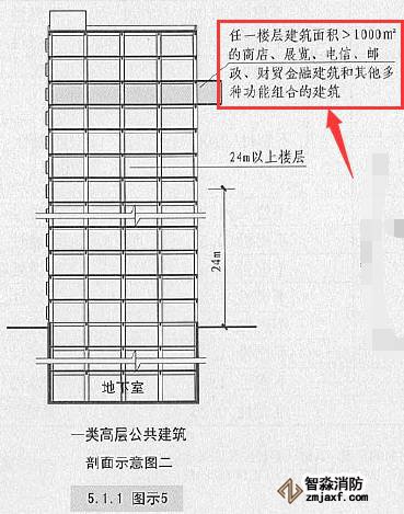 1.建筑高度大于50m的公共建筑;【圖示4】 2.建筑高度24m以上部分任一樓層建筑面積大于1000平方米的商店、展覽、電信、郵政、財(cái)貿(mào)金融建筑和其他多種功能組合的建筑;【圖示5】 3.醫(yī)療建筑、重要公共建筑; 4.省級(jí)及以上的廣播電視和防災(zāi)指揮調(diào)度建筑、網(wǎng)局級(jí)和省級(jí)電力調(diào)度建筑; 5.藏書(shū)超過(guò)100萬(wàn)的圖書(shū)館、書(shū)庫(kù)。 |