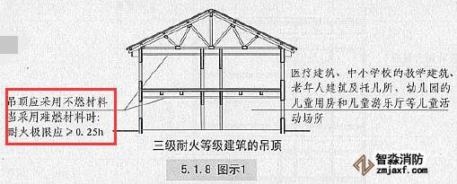 三級(jí)耐火等級(jí)的醫(yī)療建筑、中小學(xué)校的教學(xué)建筑、老年人建筑及托兒所、幼兒園的兒童用房和兒童游樂(lè)廳等兒童活動(dòng)場(chǎng)所的吊項(xiàng),應(yīng)采用不燃材料;當(dāng)采用難燃材料時(shí),其耐火極限不應(yīng)低于0.25h【圖示1】