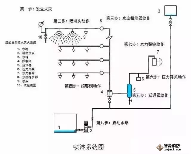 2. 濕式報(bào)警閥與水流指示有些不同,如果噴淋管道中如果水在流動,管道原有的靜壓會發(fā)生變化,會激發(fā)水力警鈴報(bào)警(它的原理可以參看一些閥門說明書),且壓力開關(guān)動作,從而來啟動噴淋水泵。