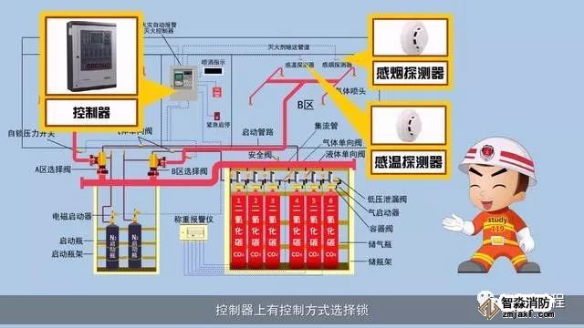 氣體滅火系統(tǒng)主要由滅火劑儲瓶和瓶頭閥、驅(qū)動鋼瓶和瓶頭閥、選擇閥(組合分配系統(tǒng))、自鎖壓力開關(guān)、噴嘴以及氣體滅火控制器、感煙火災(zāi)探測器、感溫火災(zāi)探測器、指示發(fā)生火災(zāi)的火災(zāi)聲光報警器、指示滅火劑噴放的火災(zāi)聲光報警器(帶有聲警報的氣體釋放燈)、緊急啟停按鈕、電動裝置等組成。通常氣體滅火系統(tǒng)的上述設(shè)備自成系統(tǒng)。由于氣體滅火過程中系統(tǒng)應(yīng)該執(zhí)行一系列的動作,因此只有專用氣體滅火控制器才具有這一系列的邏輯編程和執(zhí)行功能。