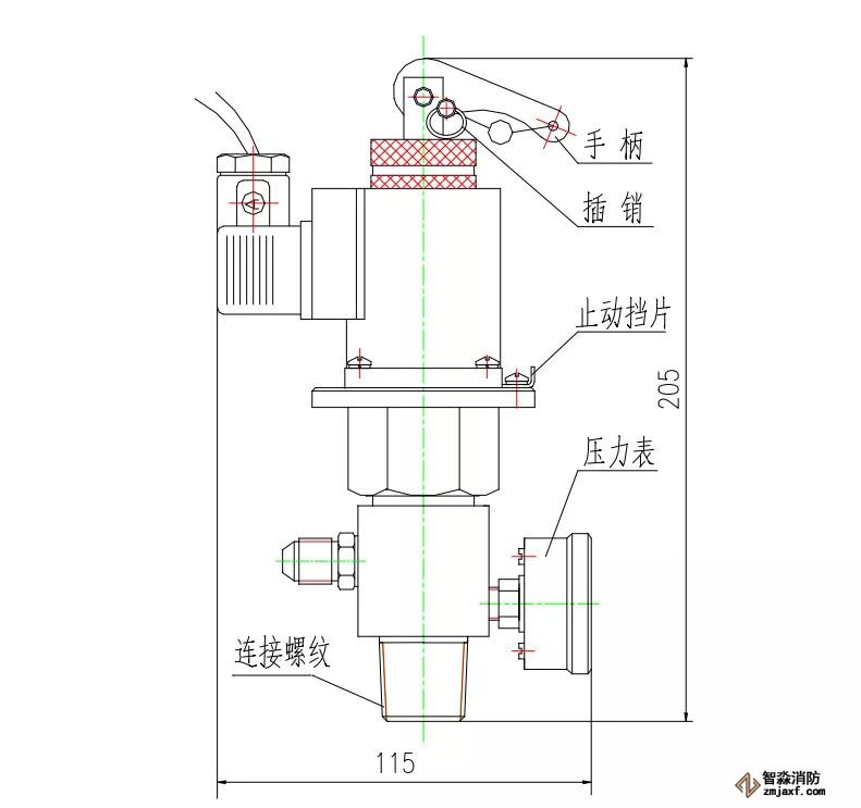電磁瓶頭閥安裝在啟動氣體儲瓶上,用以密封啟動瓶內(nèi)的啟動氣體?;馂?zāi)時,控制器發(fā)出滅火指令,激發(fā)電磁瓶頭閥內(nèi)的電磁鐵動作,打開電磁瓶頭閥,釋放啟動氣體,啟動氣體通過啟動管路打開相應(yīng)的選擇閥和瓶頭閥,釋放滅火劑,實(shí)施滅火。