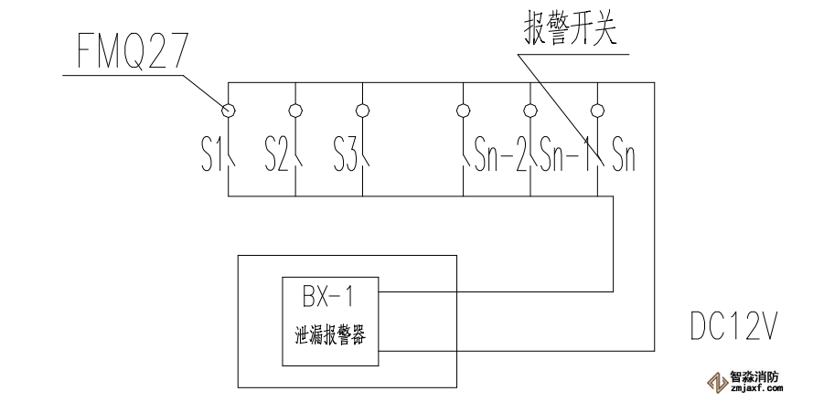 7.5.3.1所有瓶組的失重報(bào)警電路為并聯(lián)聯(lián)接,電壓為DC12V,所有接線應(yīng)接牢固,正確。任意觸點(diǎn)開關(guān)Sn閉合后均應(yīng)立即報(bào)警(n為稱重機(jī)構(gòu)任意瓶組數(shù))報(bào)警接線圖如右圖所示:
