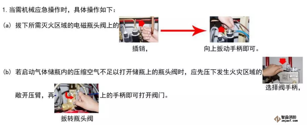 當(dāng)防護(hù)區(qū)發(fā)生火情,而控制器不能發(fā)出滅火指令時。應(yīng)通知有關(guān)人員撤離現(xiàn)場,關(guān)閉聯(lián)動設(shè)備,然后拔出相應(yīng)電磁瓶頭閥上的安全插銷,操作手柄即可打開電磁閥,釋放啟動氣體。啟動氣體打開選擇閥、瓶頭閥、釋放滅火劑,實(shí)施滅火。