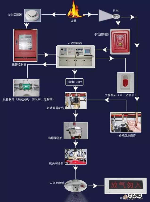 將報(bào)警滅火控制器上控制方式選擇鍵撥到“自動”位置時,滅火系統(tǒng)處于自動控制狀態(tài),當(dāng)防護(hù)區(qū)發(fā)生火情,感煙探測器與感溫探測器同時發(fā)出火災(zāi)信號,報(bào)警滅火控制器即發(fā)出聲、光報(bào)警信號,同時發(fā)出聯(lián)動指令,關(guān)閉聯(lián)鎖設(shè)備,經(jīng)過一段延時時間,發(fā)出滅火指令,打開電磁瓶頭閥釋放啟動氣體,啟動氣體通過啟動管道打開相應(yīng)的選擇閥和瓶頭閥,釋放滅火劑,實(shí)施滅火。