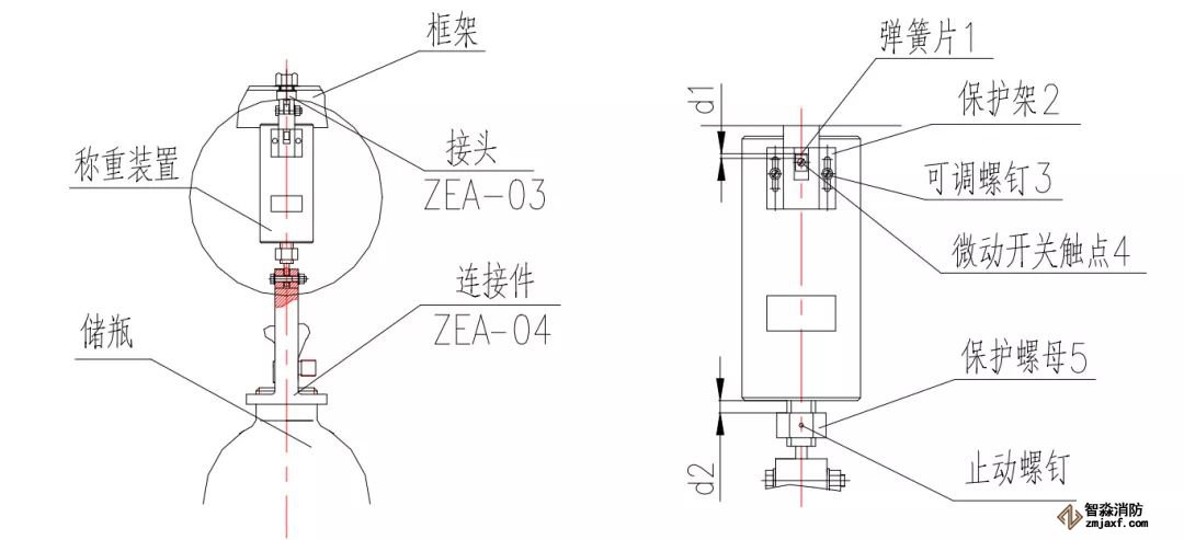 b.移動保護(hù)架來調(diào)整微動開關(guān)觸點(diǎn)4與彈簧片1之間的距離d1,調(diào)試后應(yīng)確保鋼瓶被提升(可用彈簧秤)10%藥劑重時,彈簧片4剛好觸動微動開關(guān)觸點(diǎn)1,蜂鳴器發(fā)出報(bào)警信號(聲光報(bào)警),此時緊固保護(hù)架2上的可調(diào)螺釘3。(為報(bào)警精確靈敏,可調(diào)試多次后緊固可調(diào)螺釘)