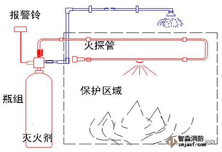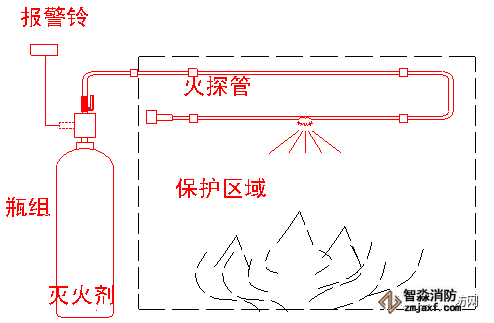 火探管一端通過容器閥連接到滅火介質(zhì)高壓容器上,另一端延伸進(jìn)入保護(hù)空間,布設(shè)在可能起火點(diǎn),進(jìn)行火源探測(cè),遇火時(shí)火探管爆破,利用火探管中的壓力下降,啟動(dòng)報(bào)警電信號(hào),同時(shí)啟動(dòng)容器閥,滅火劑輸送到火探管爆破孔,直接對(duì)著火點(diǎn)噴射滅火。