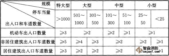 注:車庫出入口及車道數(shù)量按車庫的機動車總數(shù)量選取。如為多層車庫,其每層車庫的出入口及車道數(shù)量按其所承受的機動車數(shù)量累計計算,應(yīng)參照此表執(zhí)行。居住建筑與非居住建筑共用車庫時,按非居住類建筑設(shè)置出入口。