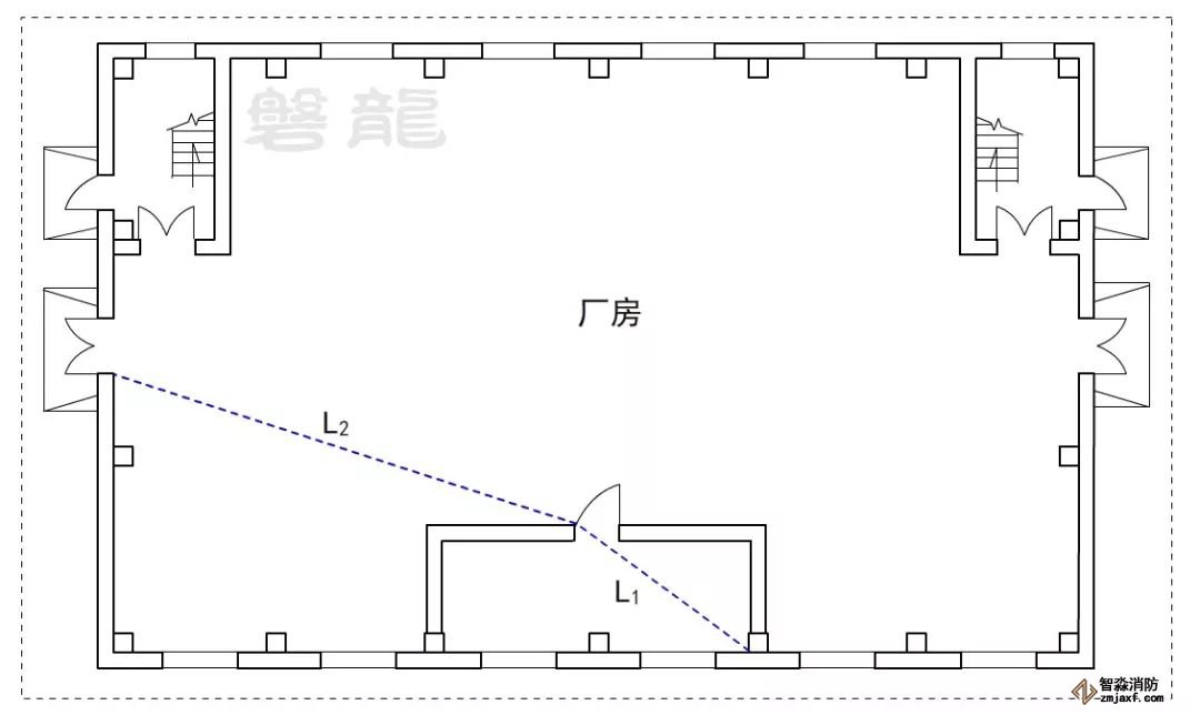 2、廠房倉(cāng)庫(kù)同樣不應(yīng)采用嵌套(穿套)設(shè)置的方式,確因功能需要,嵌套(穿套)設(shè)置的房間不應(yīng)超過一級(jí),疏散距離應(yīng)按人員行走的直線距離計(jì)算,在圖示6的廠房中,示例房間內(nèi)任一點(diǎn)至安全出口的直線距離,應(yīng)為L(zhǎng)1+L2。