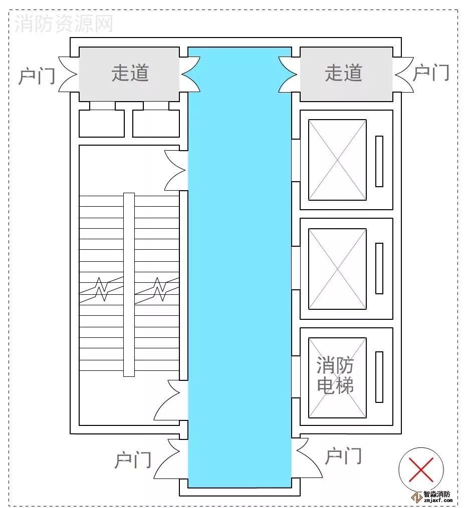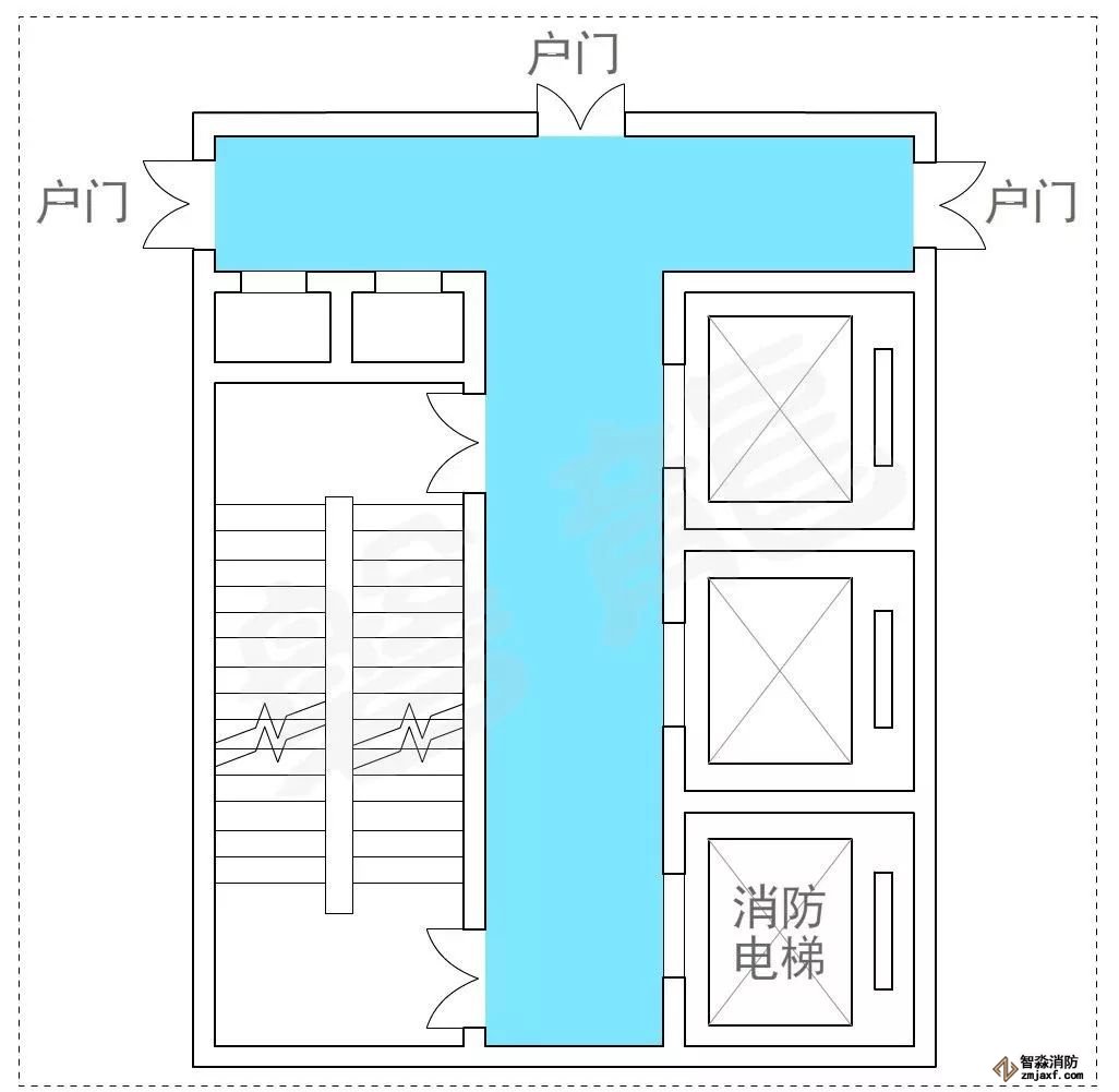 判斷原則:為防止極端方案的出現(xiàn),我們可以通過取消過道門的方式判斷,如取消過道門后滿足開向同一前室的戶門不大于3樘的要求,那么我們可以認(rèn)為過道是一種加強安全的措施,否則不應(yīng)許可!