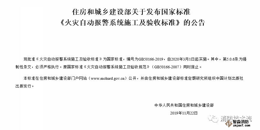在《火災(zāi)自動(dòng)報(bào)警系統(tǒng)設(shè)計(jì)規(guī)范》GB 50116-2013已經(jīng)實(shí)施多年,其對(duì)應(yīng)的施工及驗(yàn)收規(guī)范卻一直沒(méi)有更新,只能沿用《火災(zāi)自動(dòng)報(bào)警系統(tǒng)施工及驗(yàn)收規(guī)范》GB 50166—2007,而設(shè)計(jì)規(guī)范增加了許多新內(nèi)容,是施工驗(yàn)收規(guī)范沒(méi)有的,因此也給施工驗(yàn)收帶來(lái)了一些不便。近日,住建部官網(wǎng)終于發(fā)布公告,《火災(zāi)自動(dòng)報(bào)警系統(tǒng)施工及驗(yàn)收標(biāo)準(zhǔn)》GB50166-2019,于2020年3月1日正式實(shí)施。