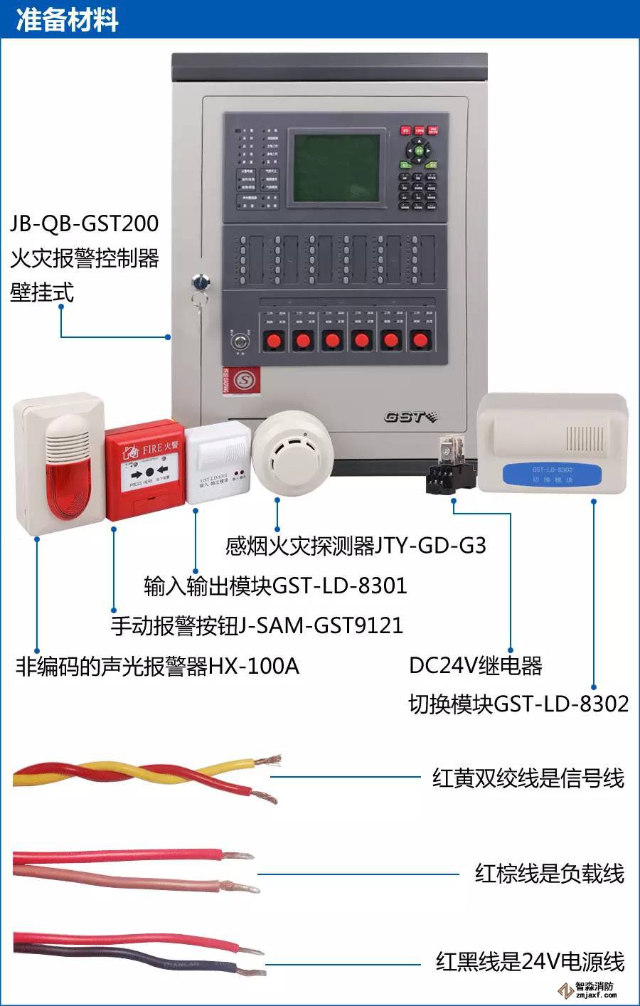 表哥用了一套最簡單的海灣報警系統(tǒng),包含一只感煙火災探測器JTY-GD-G3(型號以下簡稱G3)、一只手動報警按鈕J-SAM-GST9121(型號以下簡稱GST9121)、一只輸入輸出模塊GST-LD-8301(型號以下簡稱8301)和一只非編碼的聲光報警器HX-100A(型號以下簡稱100A)。為了擴展輸入輸出模塊8301的各種接線方法,表哥又找來了海灣的切換模塊GST-LD-8302(以下型號簡稱8302)和一個DC24V繼電器。