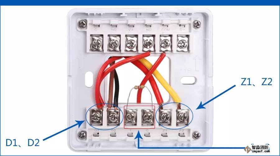 上圖中Z1、Z2是接信號線,可以從就近的9121手動報警按鈕上面并聯(lián)過來;I、G為無源反饋,這里的聲光報警器無法提供無源反饋信號,直接并聯(lián)一個4.7KΩ電阻,另外可以用編碼器將8301模塊設置成自反饋,模塊啟動后就會自動發(fā)出反饋信號;D1、D2接聯(lián)動電源,直流24V。NO與COM是一組常開觸點,將D1與NO連接,然后COM與D2接線出去直接連接負載。當模塊動作時,COM與NO接通,COM與D2就可以輸出一組24V。
