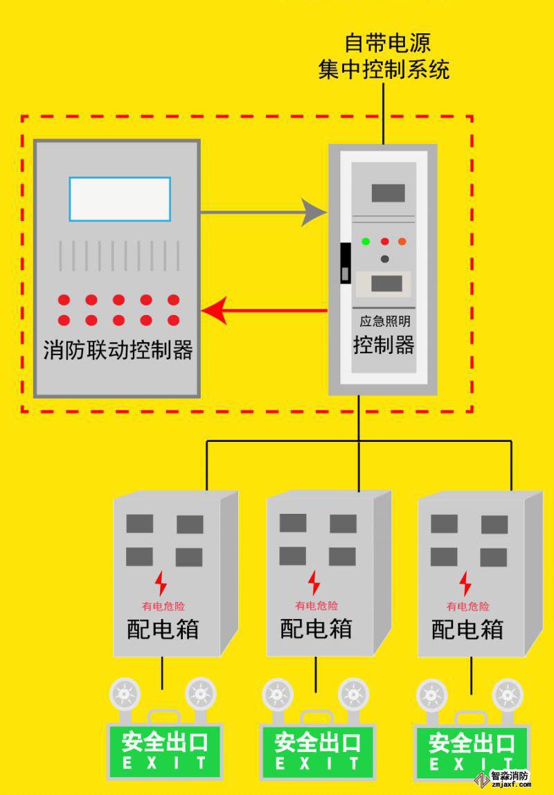 (2)自帶電源集中控制系統(tǒng)應由火災報警控制器或消防聯(lián)動控制器啟動應急照明控制器實現(xiàn)。