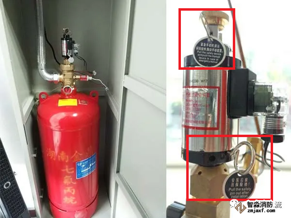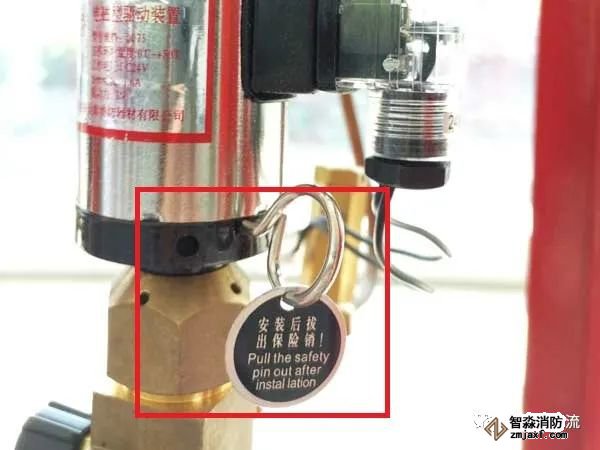 在氣體滅火系統調試驗收合格,正式投入使用后,電磁閥保險銷應拔除,否則將影響系統的自動啟動噴放。出廠時此保險銷也有標明“安裝后拔出保險銷”的提示。