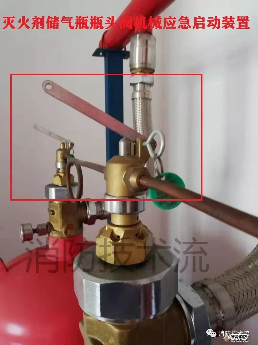 電磁閥手動保險銷安裝在電磁閥上部,此保險銷主要用于防止人為誤動作,但并不妨礙系統的自動啟動,正常情況下,此保險銷不能拔除。發(fā)生火災時,當氣體滅火控制系統失效,可進入氣瓶間,拔除發(fā)生火災的防護區(qū)對應的驅動瓶組的電磁閥手動保險銷,按下電磁閥手動啟動按鈕,啟動滅火系統實施滅火,也就是機械應急啟動。(注意:只有管網系統有此機械應急啟動操作方式。預制滅火系統由于滅火裝置放在防護區(qū)里面,發(fā)生火災時,進入防護區(qū)有危險,一般不能執(zhí)行此操作。)