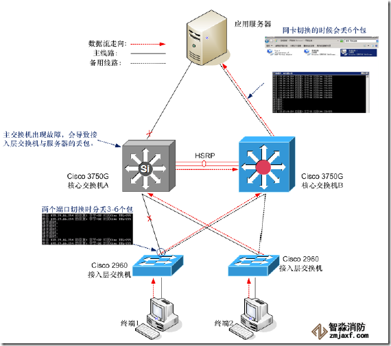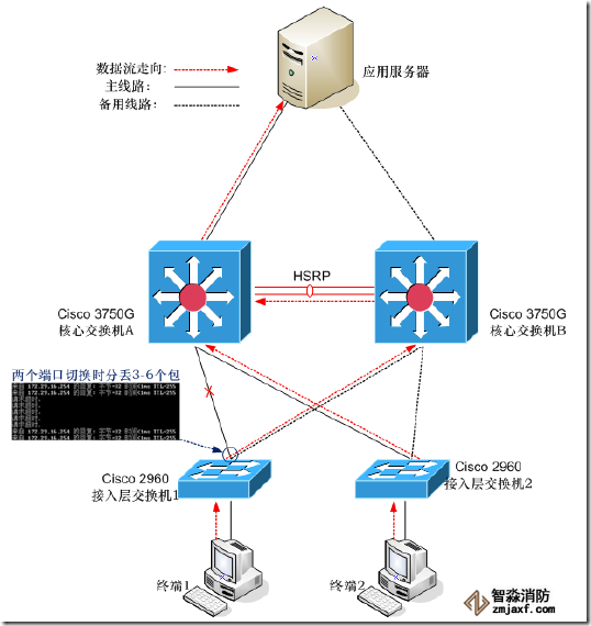 1、當(dāng)某臺接入層交換機(jī)到主核心交換機(jī)的線路出現(xiàn)故障,切換至備機(jī),數(shù)據(jù)流走向