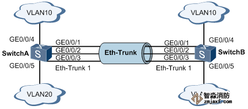 用戶希望SwitchA和SwitchB之間能夠提供較大的鏈路帶寬來使相同VLAN間互相通信。同時用戶也希望能夠提供一定的冗余度,保證數(shù)據(jù)傳輸和鏈路的可靠性。