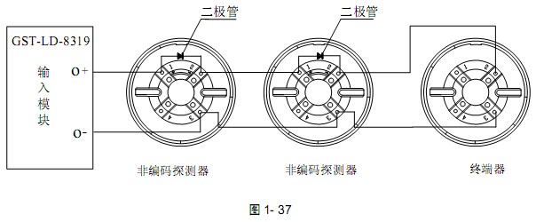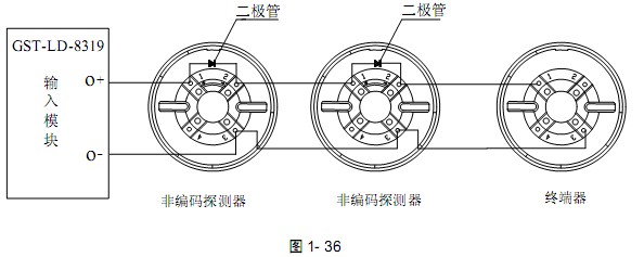 GST-LD-8319輸入模塊與非編碼探測器串聯(lián)連接時(shí),探測器的底座上應(yīng)接二極管 1N5819,且輸出回路終端必須接GST-LD-8320或GST-LD-8320A終端器,終端器可當(dāng)探測器底座使用,即在此終端器上可安裝非編碼探測器,其系統(tǒng)構(gòu)成圖如圖1- 36: