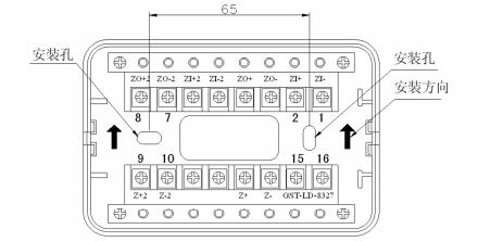 本接口的外形尺寸及結(jié)構(gòu)與 GST-LD-8302 型切換模塊相同,安裝方法也相同,底座端子示意圖
