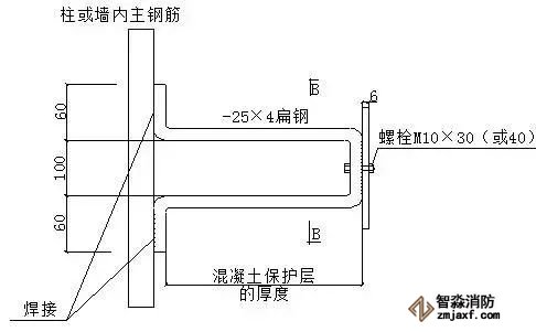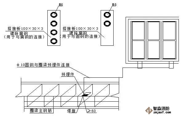 ⑶φ10的金屬圓鋼與鋼筋或窗框等建筑物金屬構(gòu)件焊接長度不小于60mm。